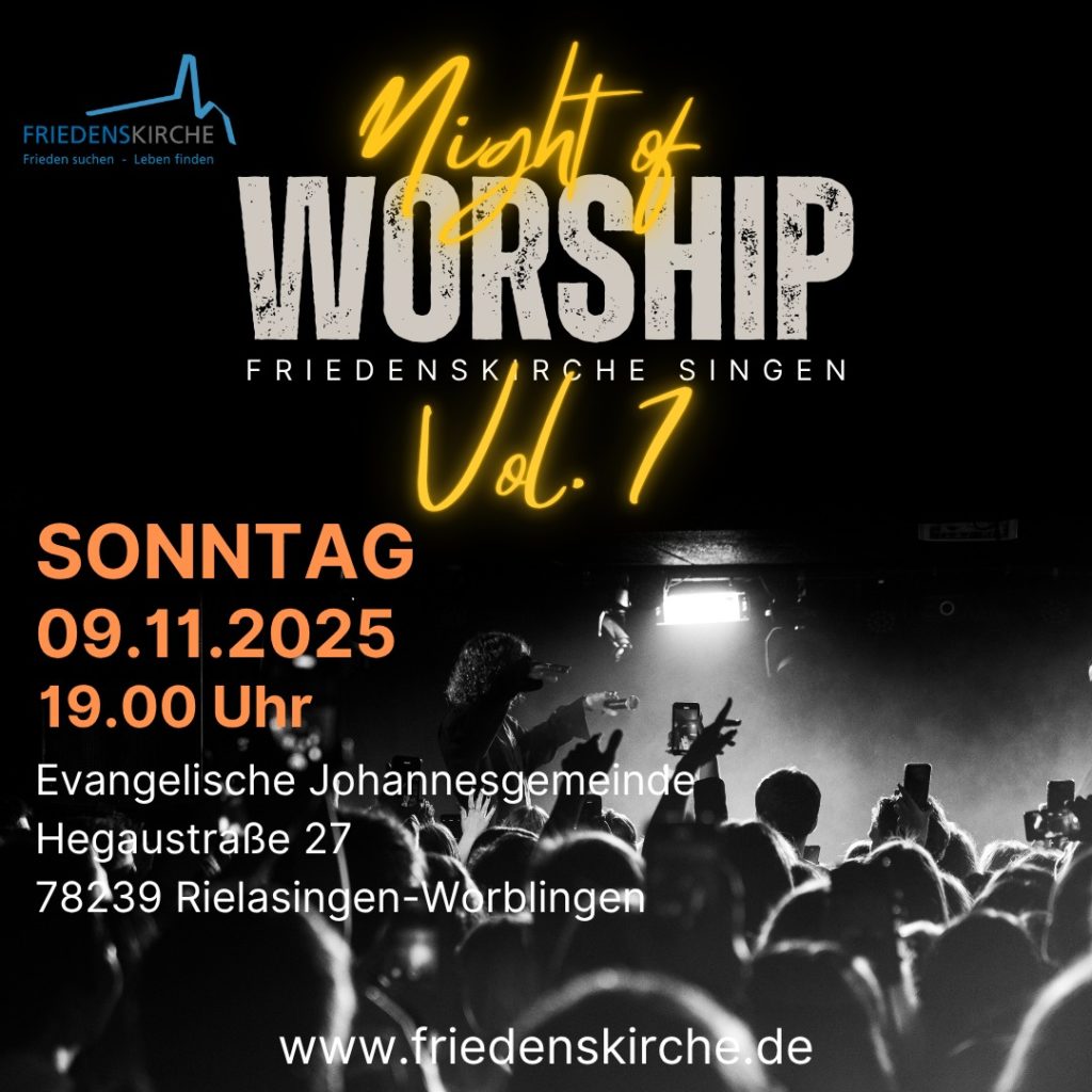 Herzliche Einladung zur nächsten Night Of Worship, die von der Friedenskirche organisiert wird. Lasst uns ganz bewusst in die Gegenwart Gottes kommen und ihn gemeinsam anbeten!