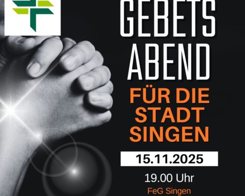 Die evangelische Allianz in Singen lädt ein zum Gebetsabend für die Stadt Singen am 15. November 2025 um 19:00 Uhr in der FeG, Freiburger Str. 4a in Singen. Wenn du es auf dem Herzen hast, betend für die Belange der Stadt vor Gott einzustehen, bist du herzlich eingeladen, mit uns zu beten! Wir freuen. uns auf Dich!